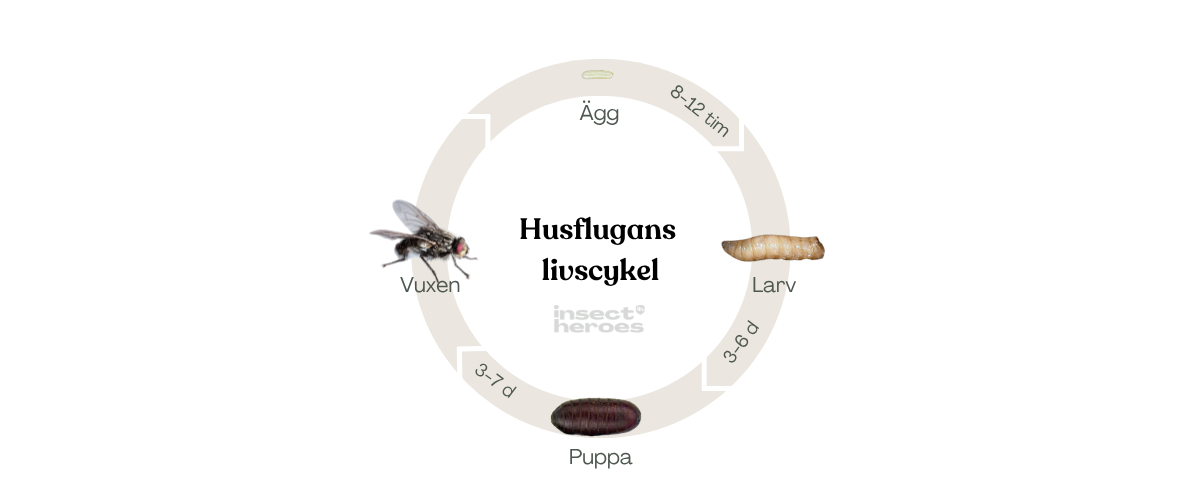 Husflugan har en snabb livscykel som endast tar 7 till 10 dagar från ägg till fullvuxen fluga, beroende på temperaturen. En vuxen hona kan lägga hundratals ägg på organiskt material som gödsel, avfall eller liknande. Dessa ägg utvecklas till larver och därefter till puppor innan de blir vuxna flugor.