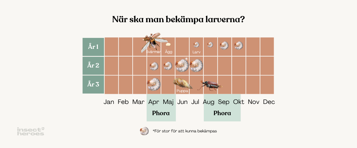 Det är bäst att bekämpa bladhorningslarver när de fortfarande är små (mindre än två centimeter). Det motsvarar ungefär fyra till åtta veckor efter att de vuxna skalbaggarna har observerats, vanligtvis mellan juni och september. Om du inte har sett några flygande skalbaggar kan du bäst bekämpa i augusti eller september.